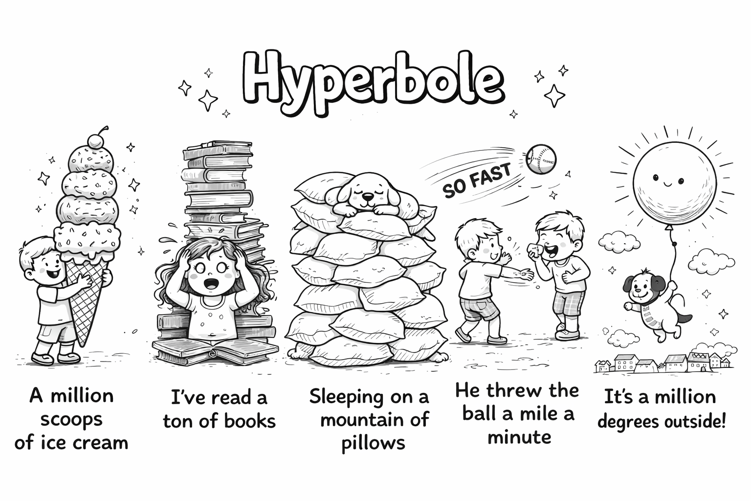 Hyperbole means using exaggeration to make something sound stronger, funnier, or more exciting.