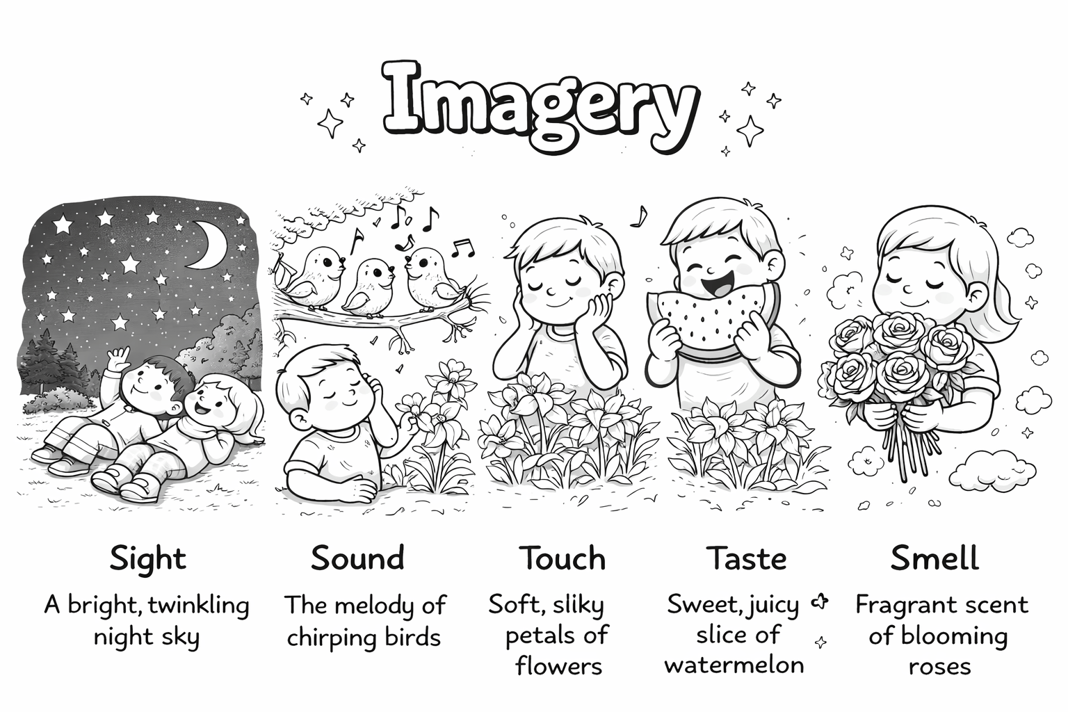 Imagery is language that helps the reader see, hear, smell, taste, or feel what is happening in a story.