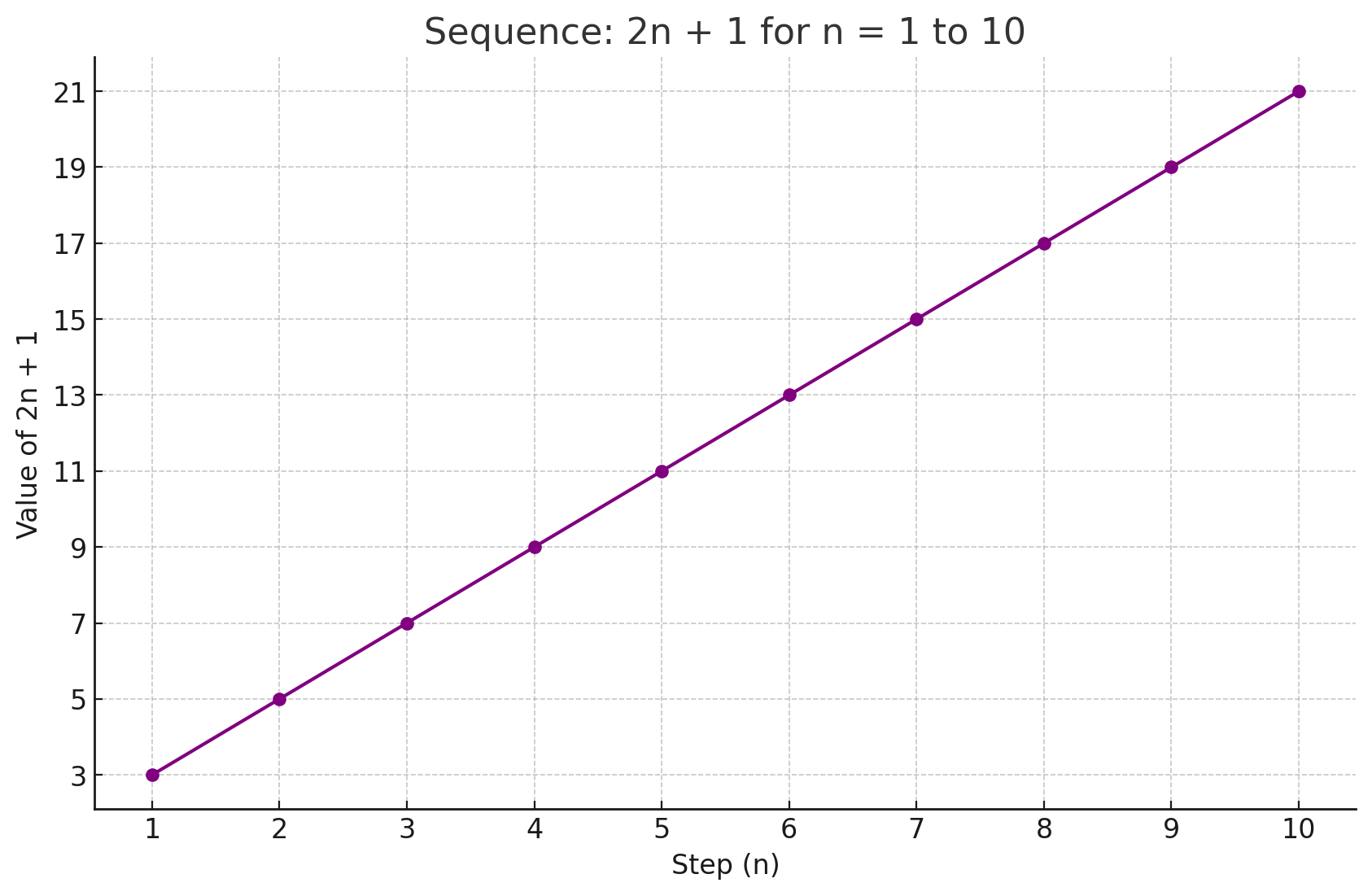 So far we have looked at sequences with linear growth. These are sequences where the value increases by the same amount each step. As we saw, the equation 2n + 1 makes the value go up by 2 each step.
