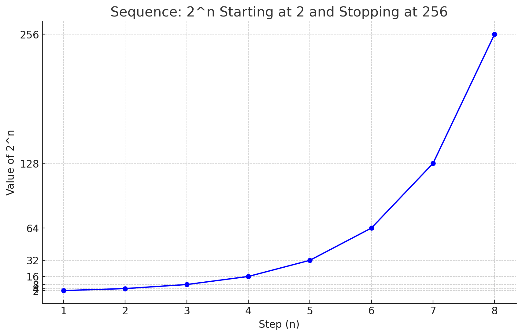 So if n (the "step") is 1, then the sum is 2, if n is 2, then the value is 4, if n is 3 the value is 8 and so on.