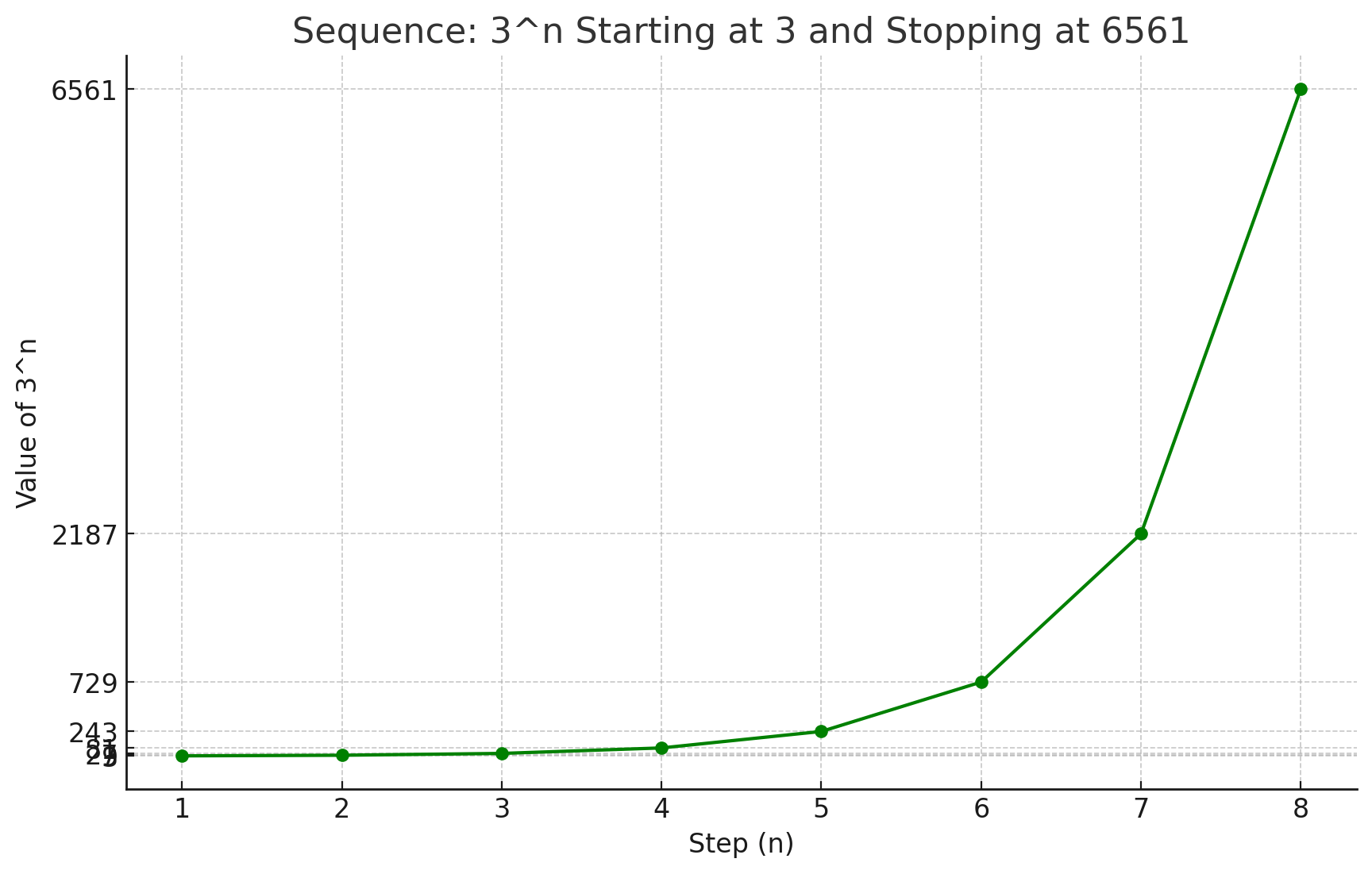 If we change the 2 to a 3, we'd be tripling the value. This is because we'd have 3, 3x3, 3x3x3, 3x3x3x3 and so on. As you can see the formula means we add a x3 (triple) each step.