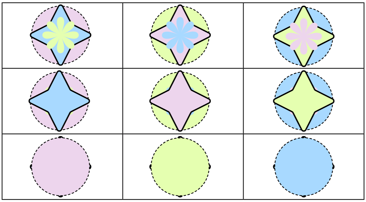 The flower symbol is in front in the first row, the star is in front in the second row and the circle is in front on the third row.