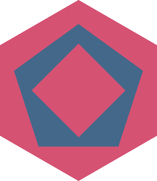But what about the colours. At first they appear random, but if we look closely, the same shape always have the same colour: the triangles are always blue, the squares always pink, the pentagons always blue, the hexagons always pink.